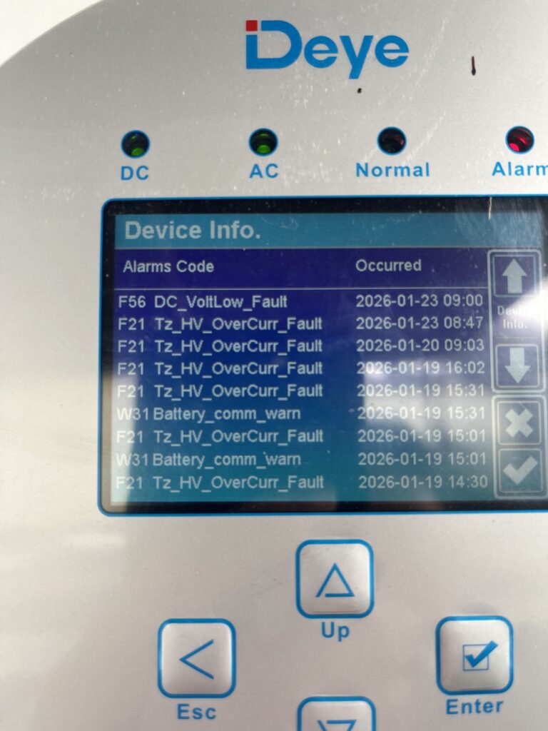 - Hőmérsékleti problémák: A Deye akkumulátorok 0°C alatt nem tölthetőek, a kültéri fagyban az egység gyakorlatilag leállt.